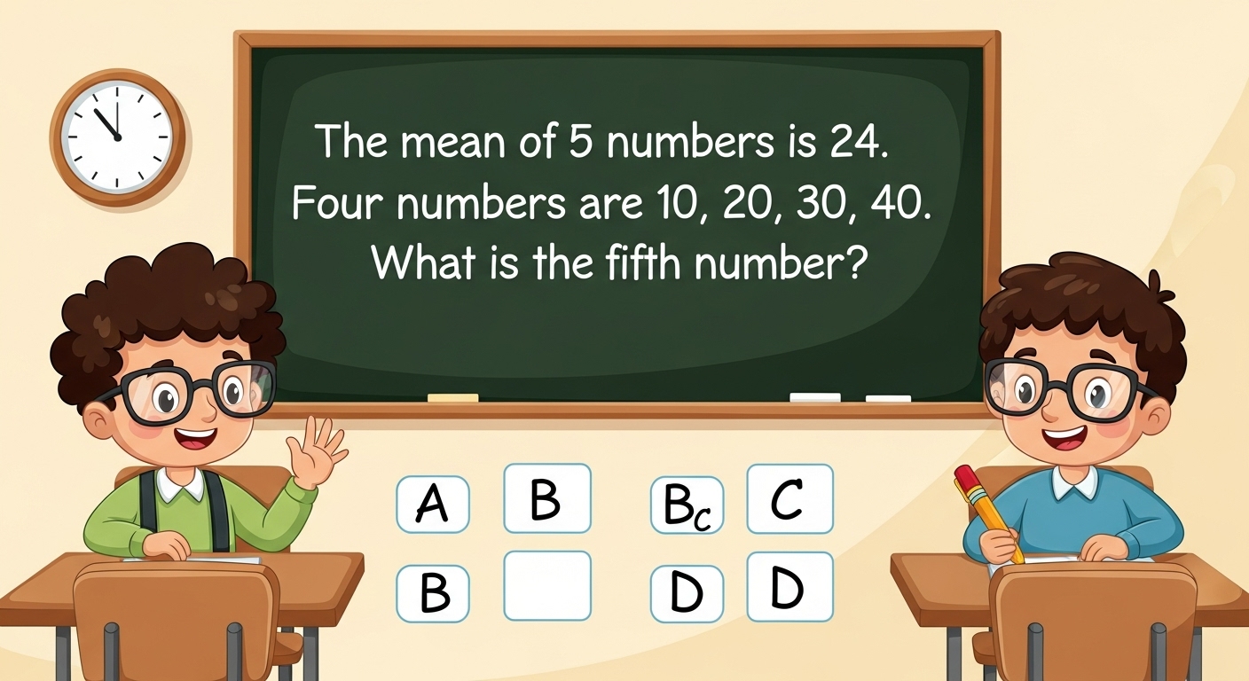 MA 1. The mean of 5 observations is 24. If four observations are 10, 20, 30, and 40, what is the fifth observation?